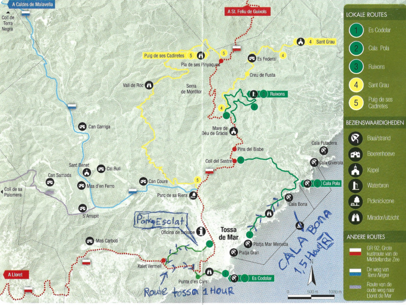 Bent u echt een wandelaar avonturier ontdek dan de route naar cala pola vanaf platja mar Menuda (aangegeven met groene streep) de uitzichten zijn indrukwekkend en bij cola bona kunt een duik nemen en een drankje doen bij het restaurant (alleen in het hoog seizoen), u vind hier ook de grotten van 3 meter hoog waar u in kunt zwemmen ….pas wel op voor de rondvaardboten. de route kent veel trappen dus zeker niet kinderwagen vriendelijk goede schroenen en drinken meenemen is een pre.